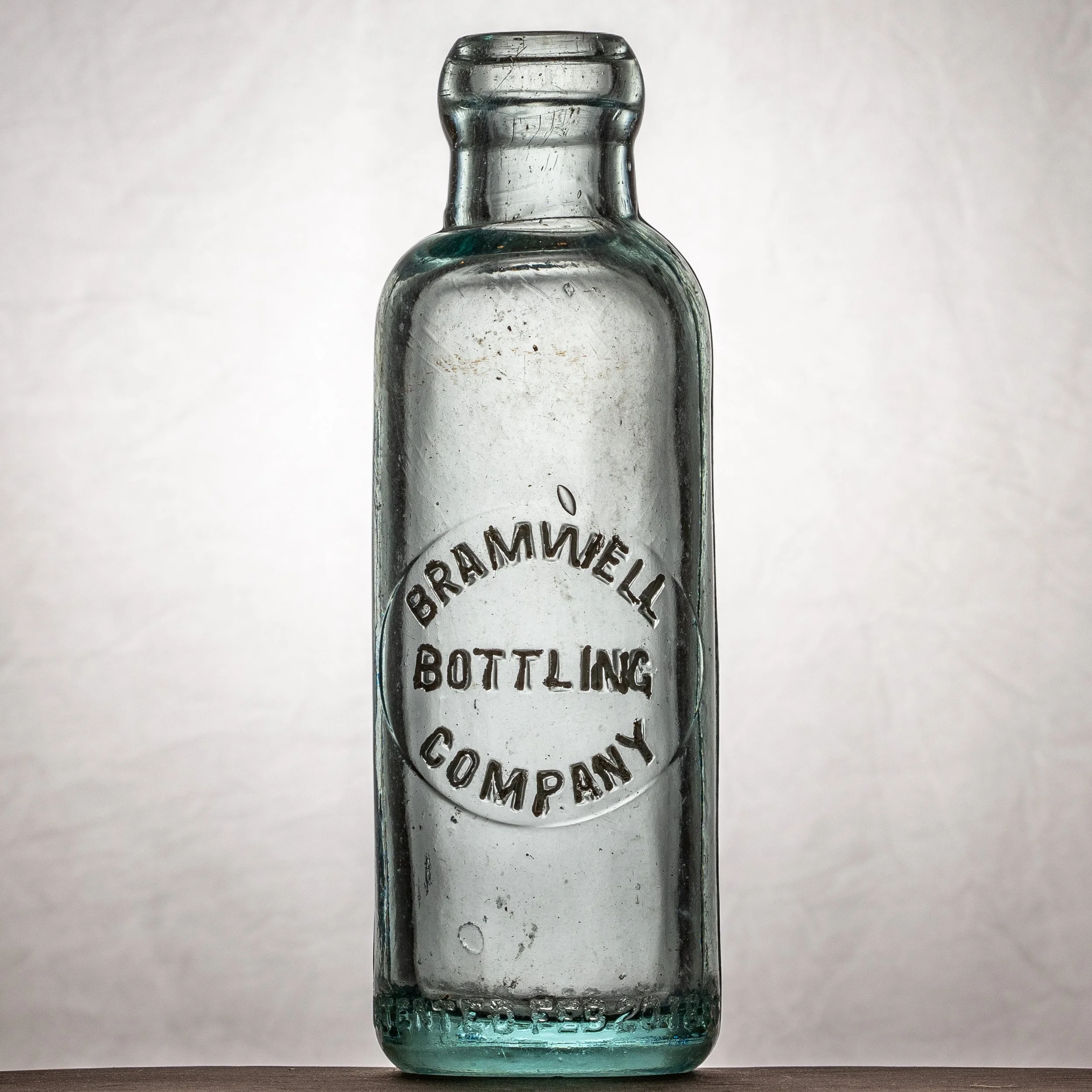 Bramwell Bottling Company, Roorbach-stopper (gravitating ball) style bottle. Aqua blue glass. Heel is embossed with patent information.